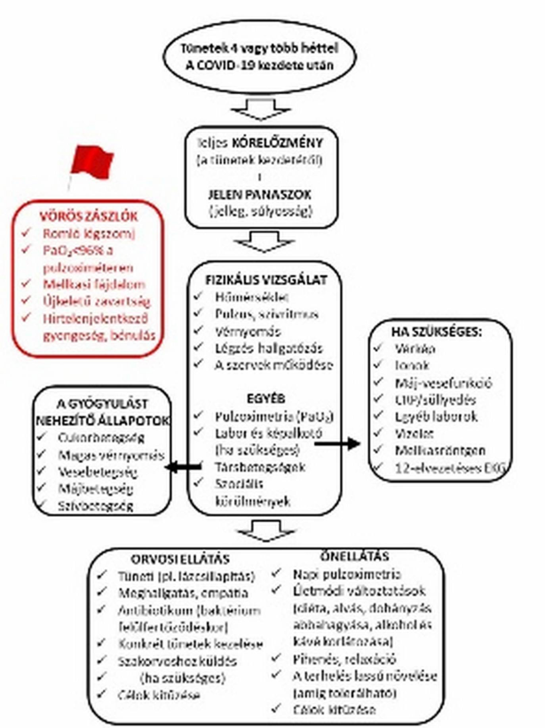 A sclerodermás betegeket, akiknél az alapbetegség számos szervet érint, jobban és elhúzódóbban érinti a betegség, ha elkapják a koronavírus fertőzést. A scleroderma maga is érinti a tüdőt, gyulladás, majd kötőszöveti átalakulás (fibrózis) alakul ki. Hasonló eltéréseket okozhat a súlyos vagy elhúzódó COVID-19 is. A scleroderma és a COVID-19 ugyancsak érintheti a szívizmot, a gyomor-bélrendszert és a veséket is. Ezért is fontos, hogyha egy sclerodermás beteg elkapja a koronavírus fertőzést, haladéktalanul meg kell keresnie szakorvosát is és nagyon alaposan át kell vizsgálni a belső szerveket. A COVID-19 elhúzódó tüdőgyulladást és akár tüdőfibrózist okozhat, így szoros követés, a vírusfertőzésből való kigyógyulás után is rendszeres kontroll, szükség esetén ismételt tüdő CT, szívultrahang vizsgálat, laborvizsgálatok szükségesek. Figyelni kell a poszt-COVID vagy hosszú COVID betegségre is, amely a koronavírus fertőzésen átesettek 20-30%-ában még hetekig, hónapokig is tüneteket okozhatnak. Ezt az állapotot a sclerodermás betegek nehezebben vészelik át, ezért a beteg, a háziorvos, a sclerodermát kezelő szakorvos és a COVID-19 betegséggel foglalkozó orvos együttműködése szükséges. Az 1. ábrán látható, hogy a koronavírus fertőzést követően felgyógyuló vagy még tünetekkel rendelkező beteg és háziorvosa miket tegyen a teljes gyógyulás érdekében és milyen esetekben szükséges poszt-COVID szakrendelésre vagy kórházba menni (ún. vörös zászlók).